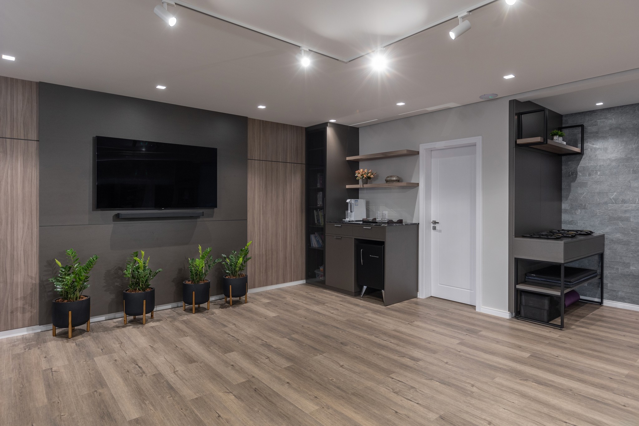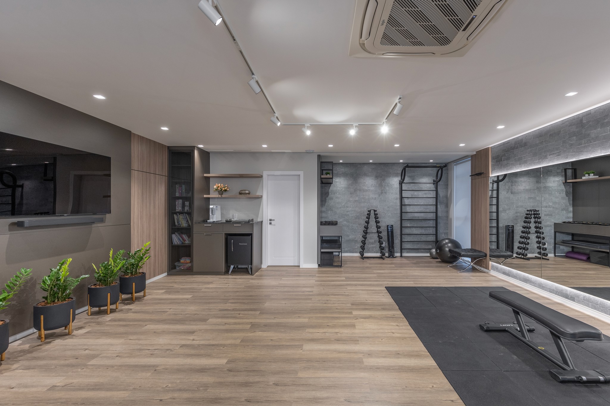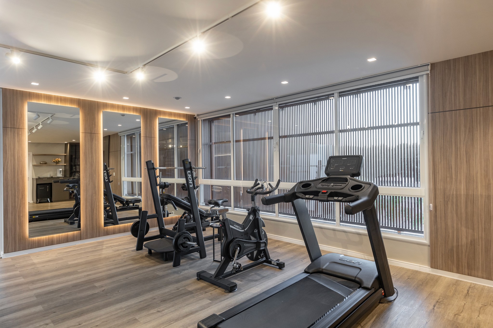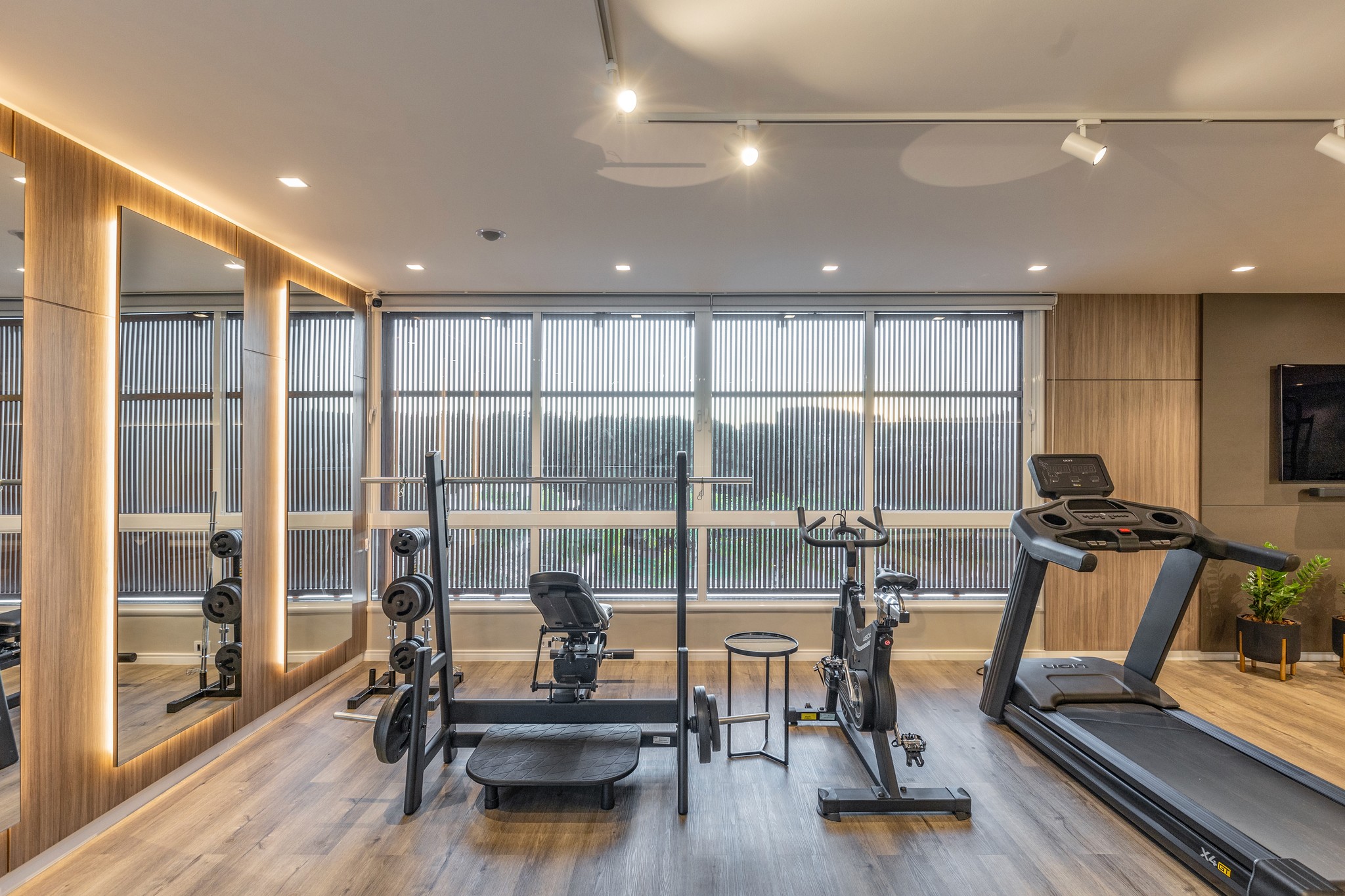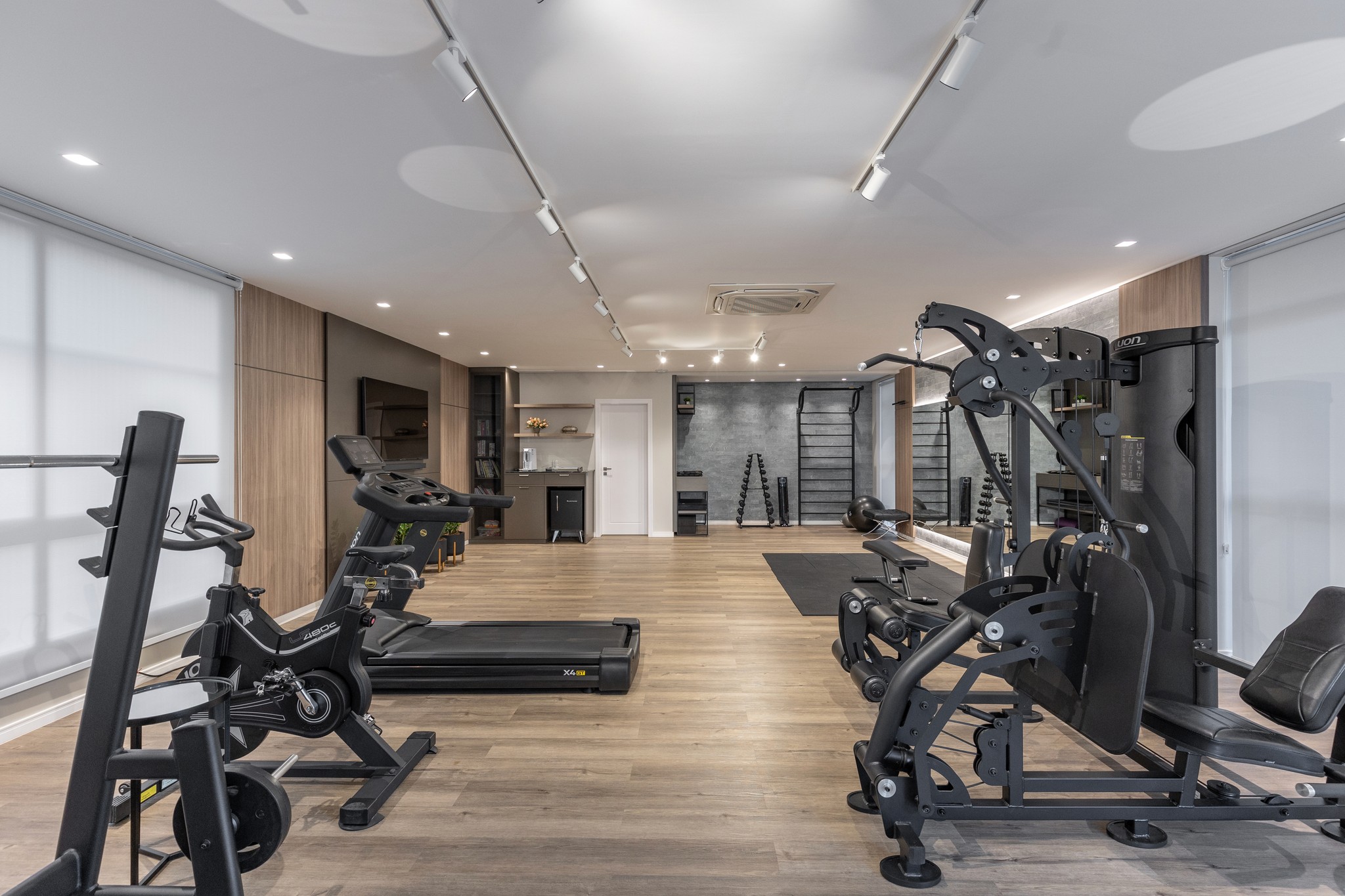 Projeto arquitetônico e de interiores de academia residencial, com espaços amplos, iluminação natural e brise metálico amadeirado, que alia conforto térmico, privacidade e integração com o entorno.