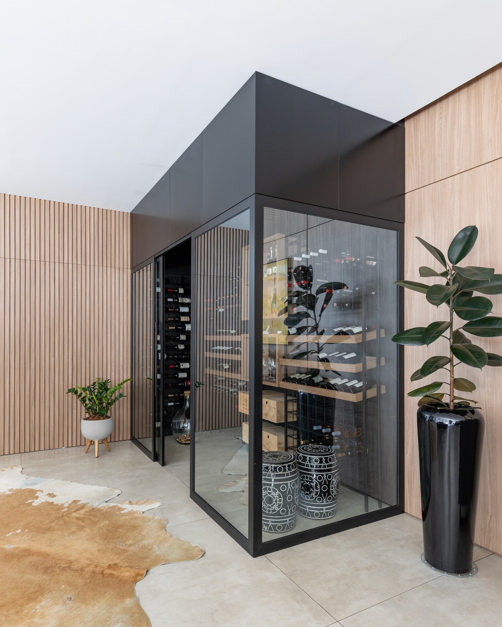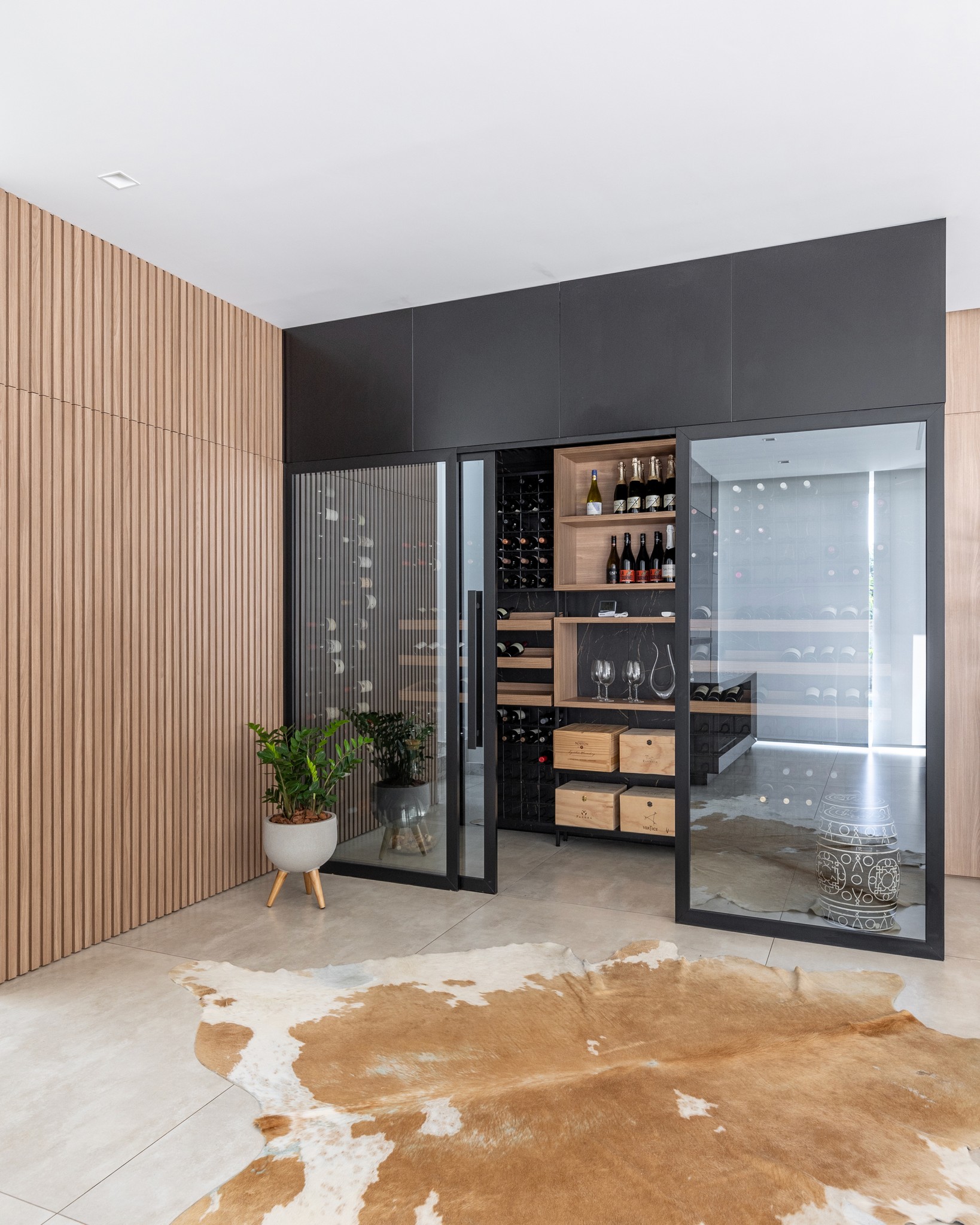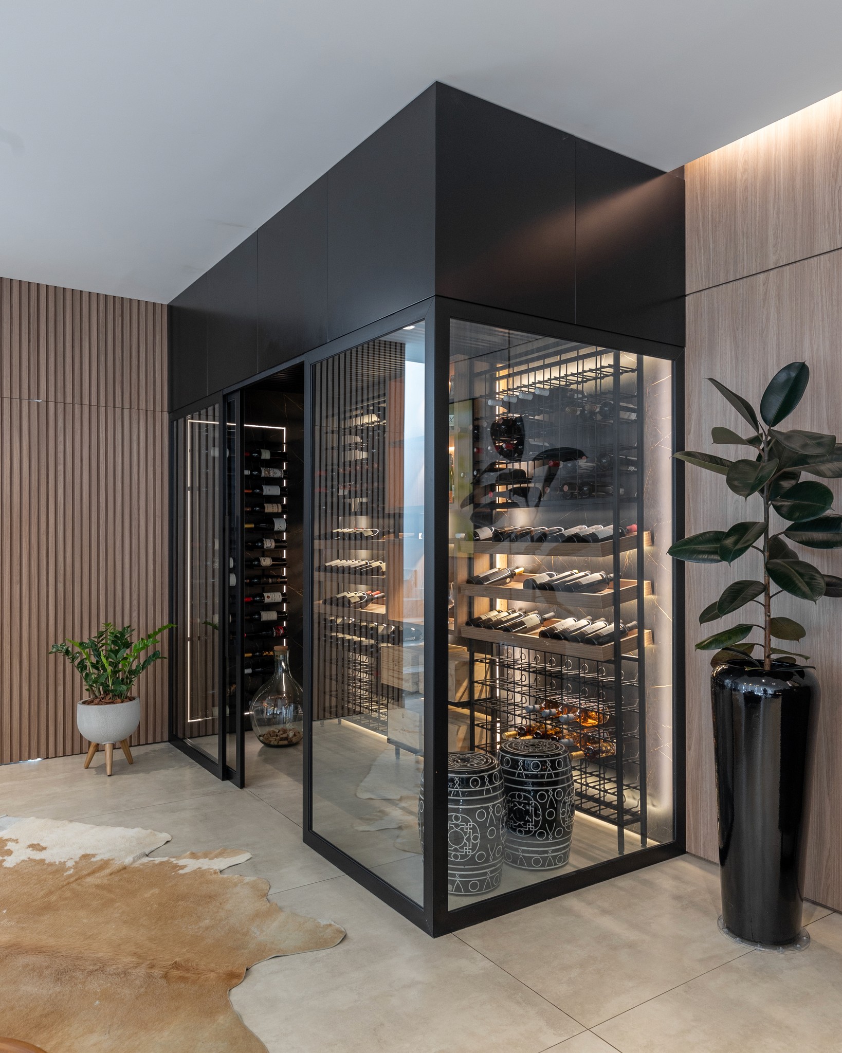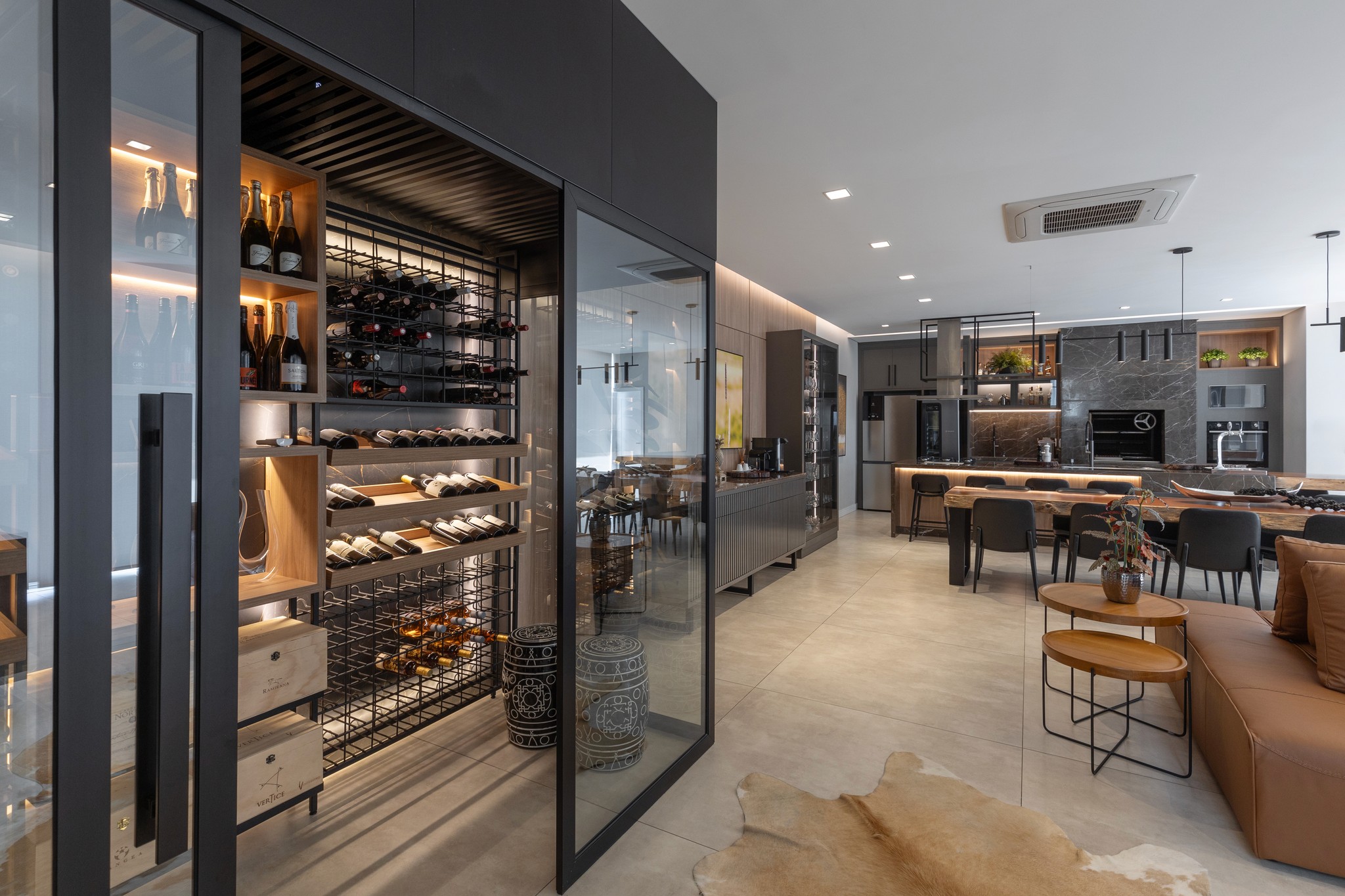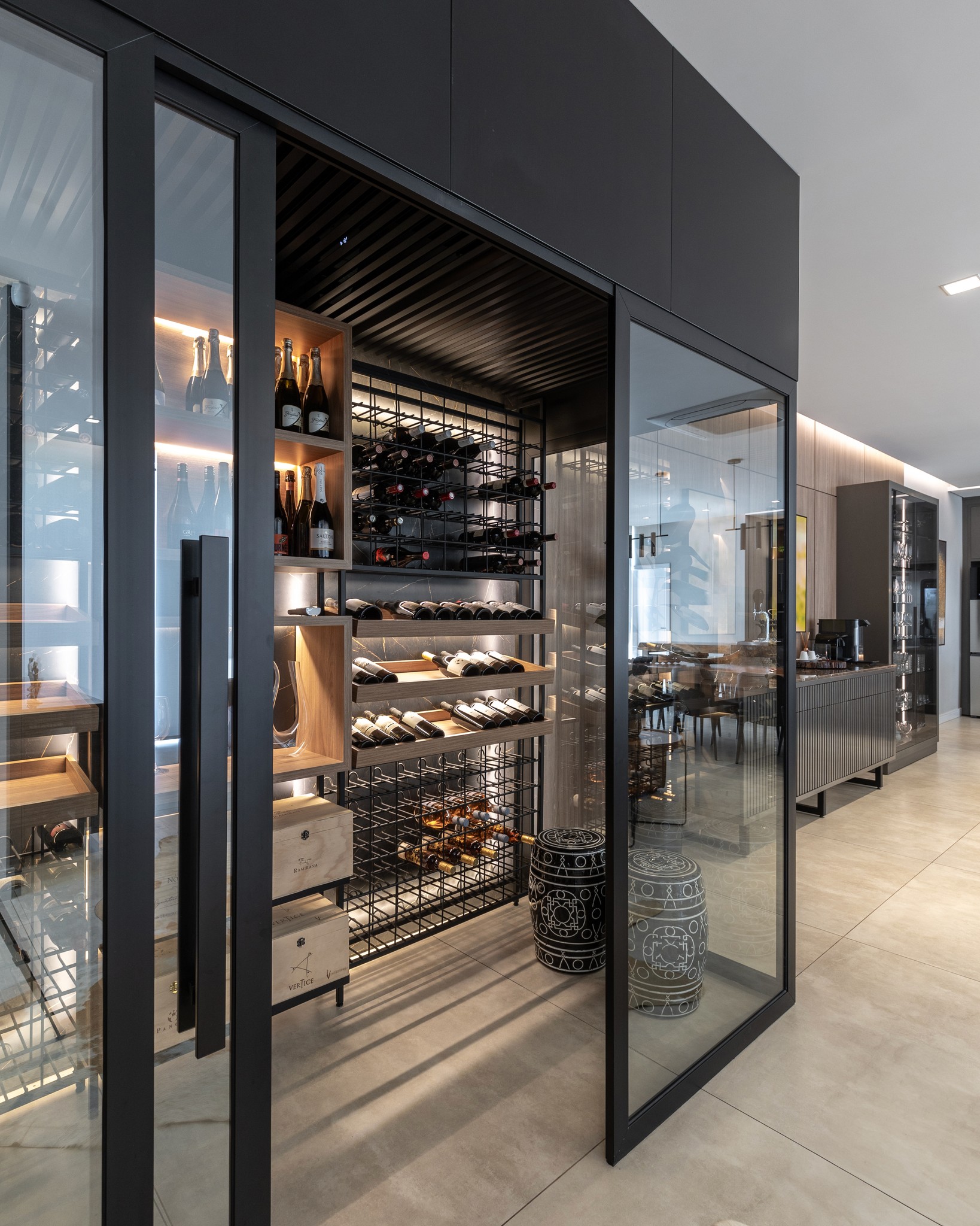 Adega climatizada residencial de alto padrão, integrada ao espaço de festas, unindo funcionalidade, sofisticação e design para valorizar a experiência dos encontros.