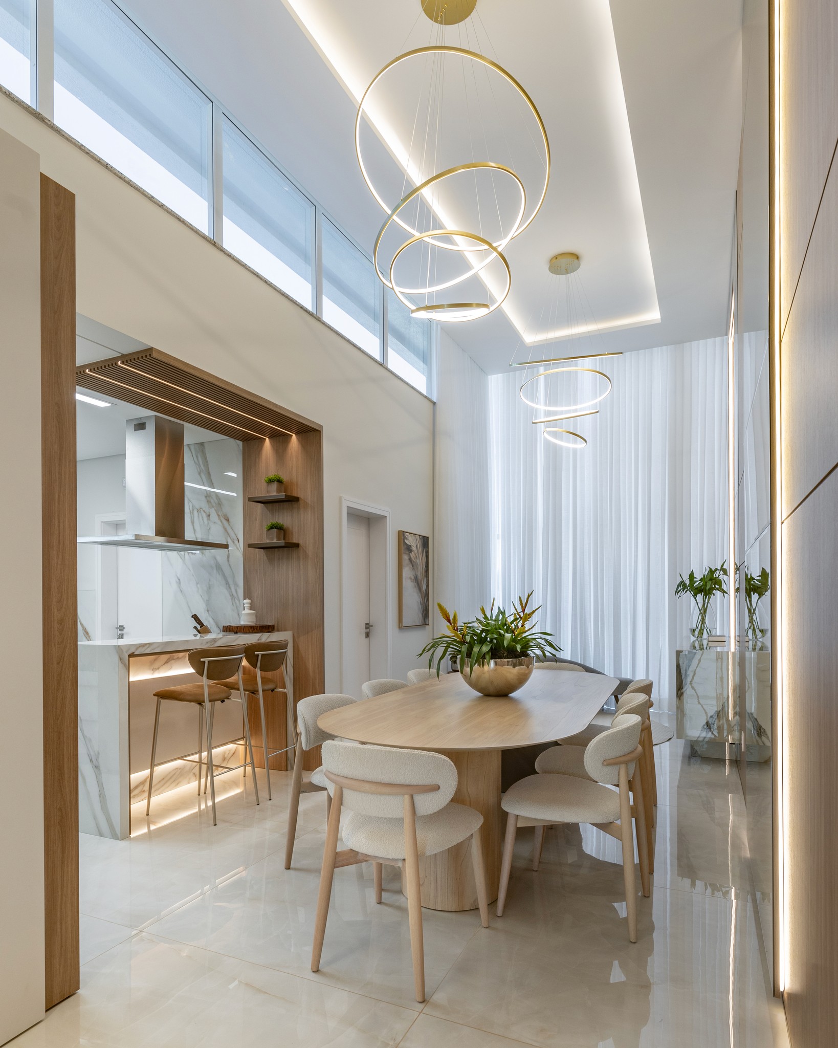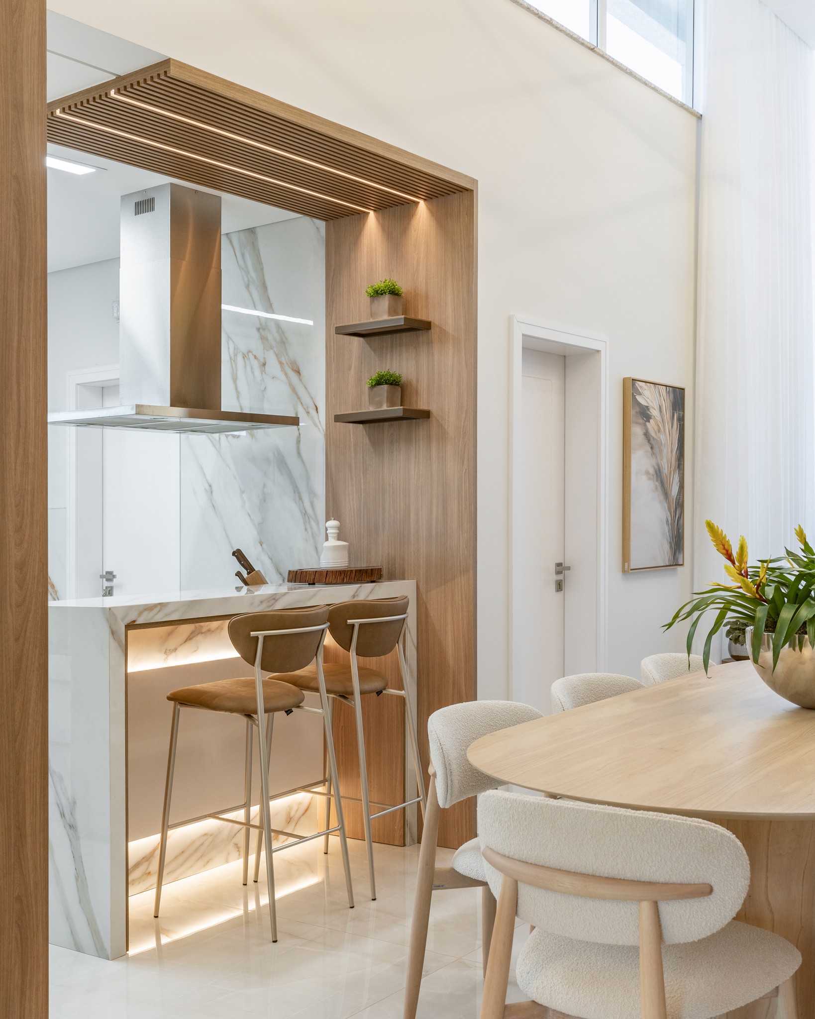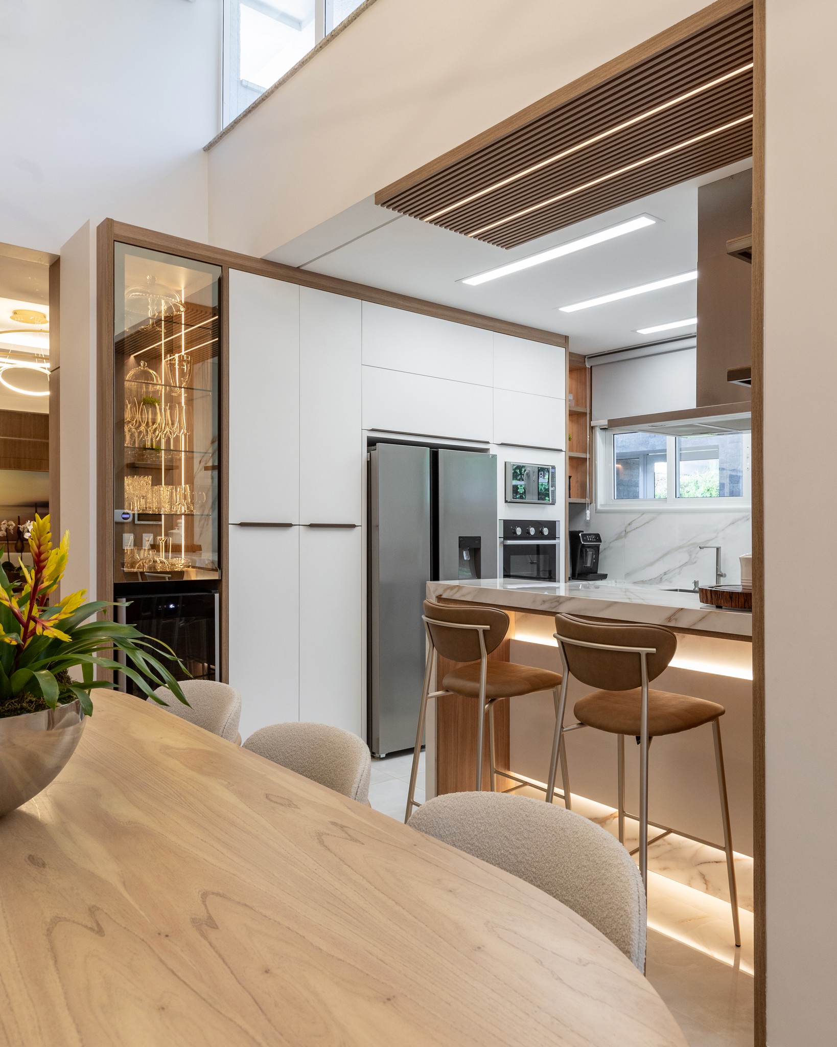 Outro ângulo deste ambiente integrado, onde a cozinha foi projetada para unir praticidade e funcionalidade ao uso diário, com paleta clara que amplia o espaço e detalhes amadeirados que trazem aconchego e sofisticação.