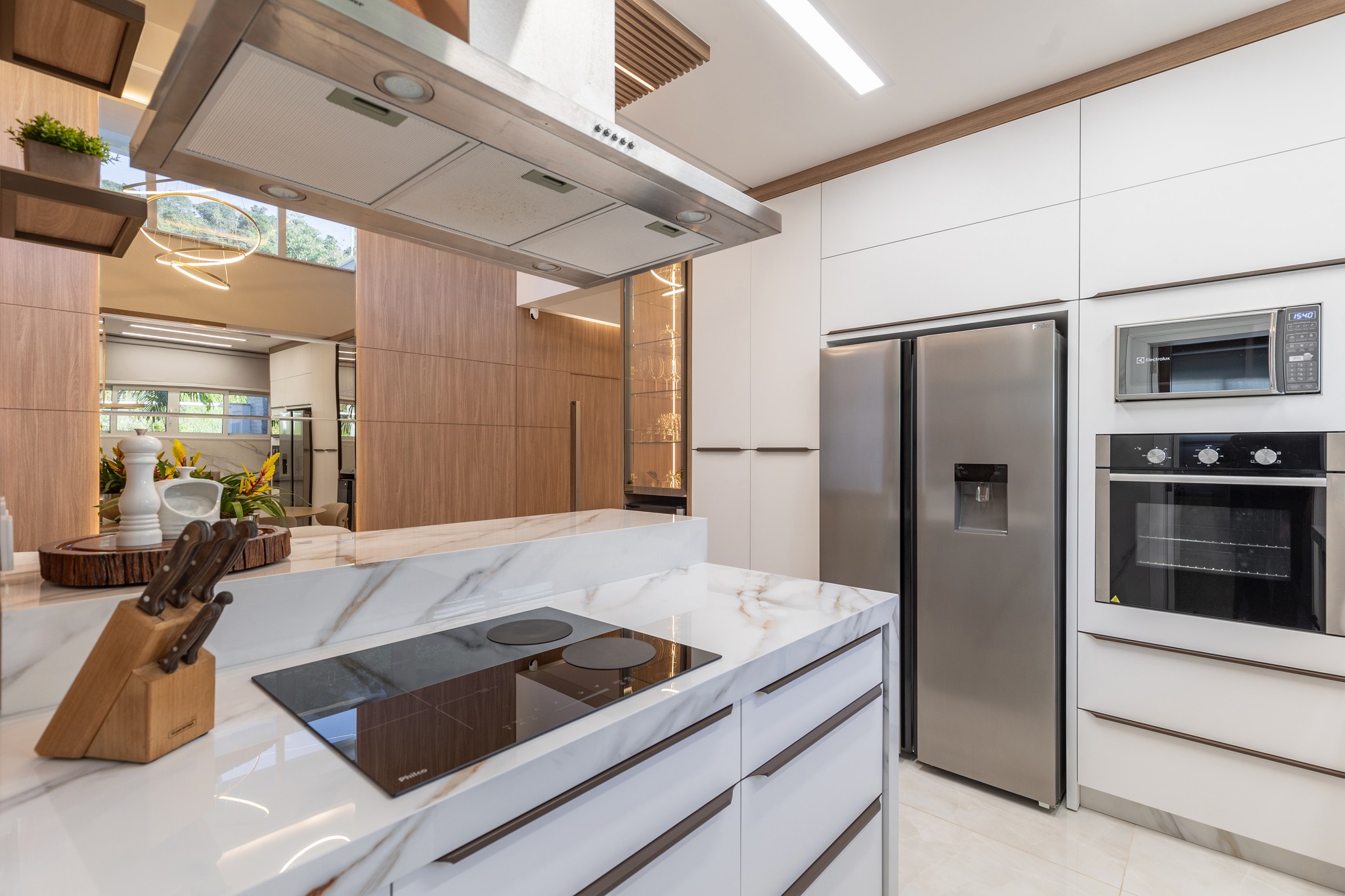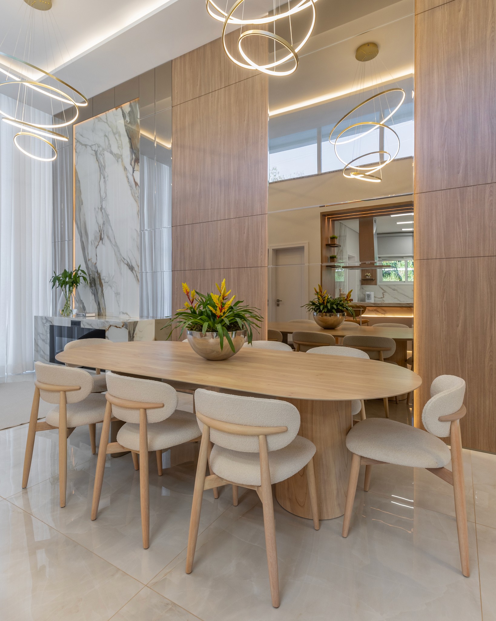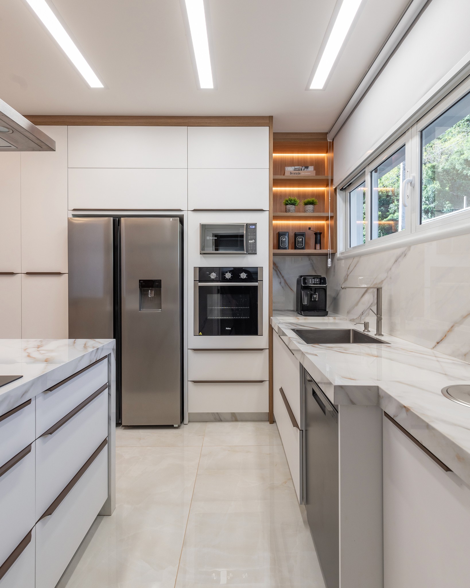 Outro ângulo deste ambiente integrado, onde a cozinha foi projetada para unir praticidade e funcionalidade ao uso diário, com paleta clara que amplia o espaço e detalhes amadeirados que trazem aconchego e sofisticação.